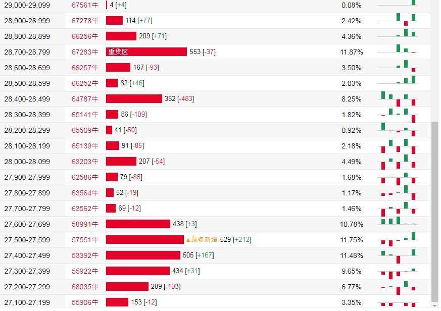 牛证街货重货区在28700-28799区间,该区间最新牛证数量为553张,较上一交易日减少37张;最多新增在27500-27599区间,该区间最新牛证数量为529张,较上一交易日增加212张。