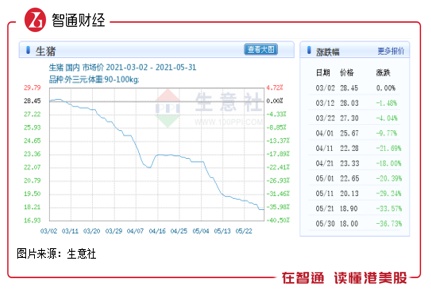 智通财经APP了解到,2021年以来猪价跌势明显,1月初生猪价格在32元左右,到五月底已跌至20元以下,跌幅接近50%。生猪价格持续下跌,使得上市猪企股价一路走熊,A股龙头牧原股份从高点131元跌至90元,部分中小市值的猪企股价已腰斩,如A股的新希望/金新农及港股的中粮家佳康(01610)。