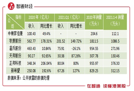 港股猪企主要为万州国际(00288)和中粮家佳康(01610),其中万州国际为全球性企业,生猪养殖销售超过45%,2020年,该业务收入122.96亿美元,占比48%。但万洲国际的核心收入在美国,收入及利润在2020年国内猪价大涨时并未得到很大的提升。中粮家佳康(01610)属于中小猪企,2021年前四个月出栏量112.1万头。