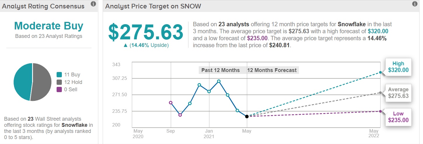 华尔街有11位分析师予Snowflake“买入”评级,12位予“持有”评级,共识评级为“温和买入”(Moderate Buy),平均目标价为275.63美元,意味着较当前股价有14%的上涨潜力。
