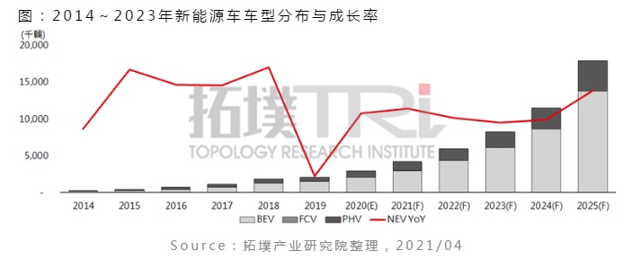 PHEV因欧系车厂推动力道大,加上符合欧洲的生活情境和满足车厂需降低平均碳排放的需求,2020年于欧洲市场大幅成长,未来将可看到纯电行驶里程数高于100km车款,预计2021年全球成长率为45%。HEV主要市场为日本和美国,日本在2030年禁售燃油车计划中已确定排除限制HEV,意即可继续贩售HEV,因此日本BEV与PHEV能否成长须看日系车厂的规划。