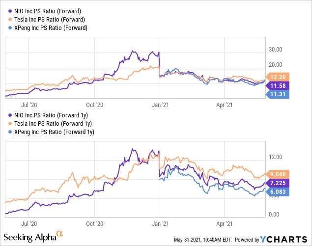 展望2022年,目前股价对应预期收入的7倍,而小鹏、特斯拉分别对应预期营收的6倍、7倍。