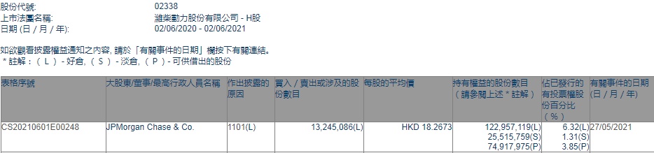 智通财经APP获悉,香港联交所最新资料显示,5月27日,小摩增持潍柴动力(02338)1324.5万股,每股作价18.27港元,总金额约为2.42亿港元。增持后最新持股数目约为1.23亿股,最新持股比例为6.32%。
