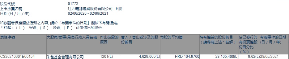 智通财经APP获悉,香港联交所最新资料显示,5月27日,朱雀基金管理有限公司减持赣锋锂业(01772)462.9万股,每股作价104.97港元,总金额约为4.86亿港元。减持后最新持股数目约为2310.5万股,最新持股比例为9.62%。