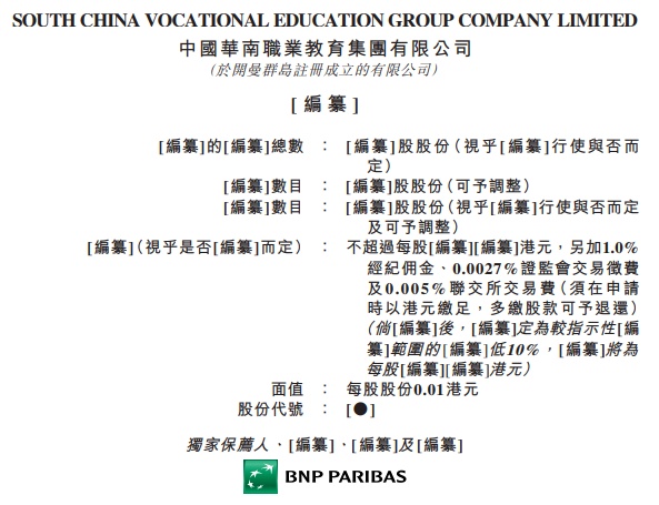 智通财经APP获悉,据港交所6月2日披露,中国华南职业教育集团有限公司向港交所递交主板上市申请,BNP Paribas为其独家保荐人。