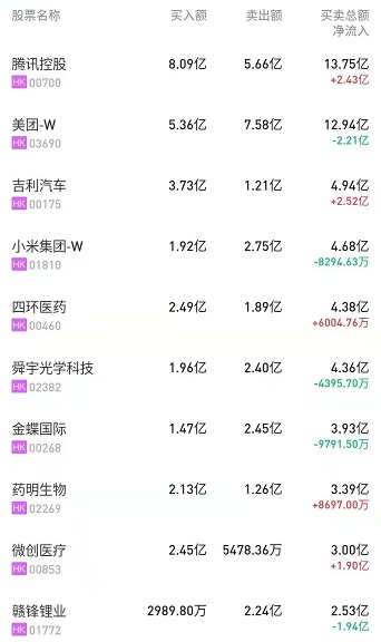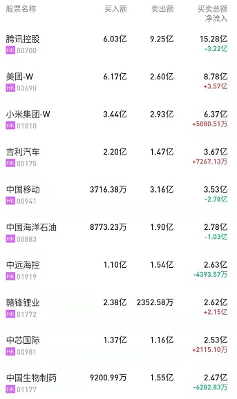 此外,药明生物(02269)、中芯国际(00981)分别获净买入8697万、2115万港元。而中移动(00941)、腾讯(00700)、中生制药(01177)分别遭净卖出2.78亿、7814万、6282万港元。