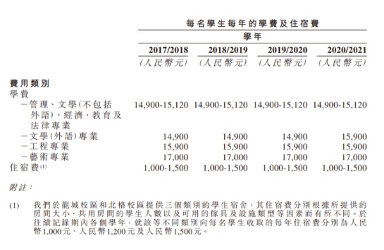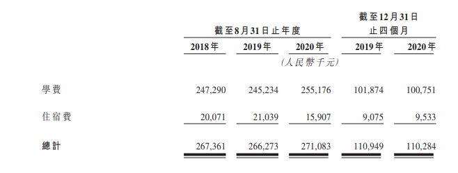 截至2018年、2019年及2020年8月31日止年度及截至2020年12月31日止四个月,学费所产生的收益分别为2.47亿元、2.45亿元、2.55亿元及人民币1.00亿元;分别占总收益92.5%、92.1%、94.1%及91.4%。同期,住宿费所产生的收益分别为2010万元、2100万元、1590万元及950万元,分别占总收益的7.5%、7.9%、5.9%及8.6%。