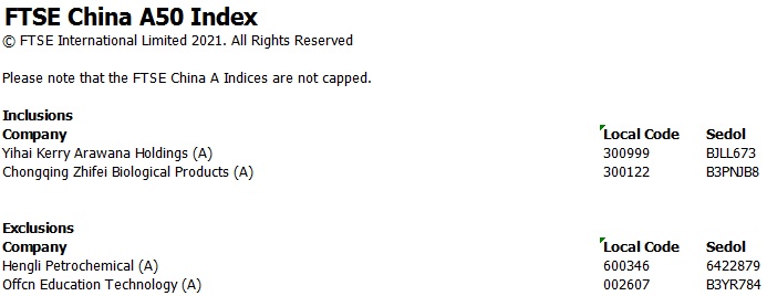富时中国A50指数将纳入金龙鱼(300999.SZ)、智飞生物(300122.SZ),剔除恒力石化(600346.SH)、中公教育(002607.SZ)。