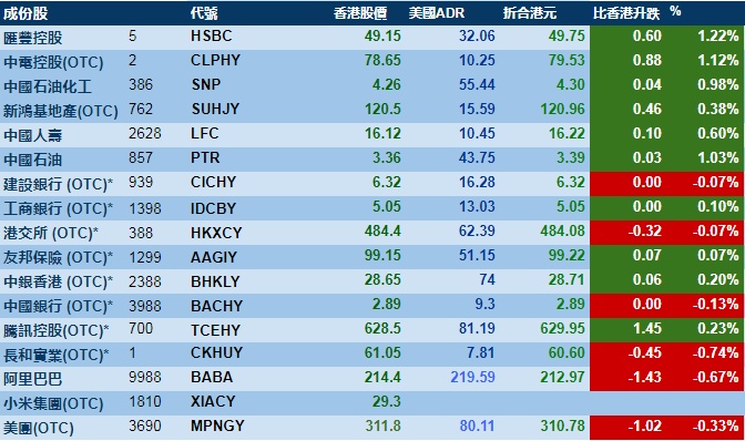 大型蓝筹股多数上涨,汇丰控股收报49.75港元,较港收市涨1.22%;腾讯控股收报629.95港元,较港收市涨0.23%。
