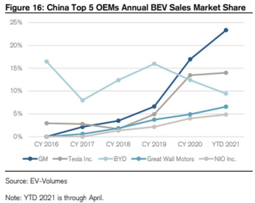 另外,报告指出,特斯拉在中国(全球最大汽车市场)的市场份额也由3月份的19%跌至4月份的8%。对此,有媒体援引Levy的报告,并总结道:“受五菱宏光Mini EV销量持续增长的推动,通用集团4月份在中国的市场份额仍居领先地位,市场份额占比达到了20%。”