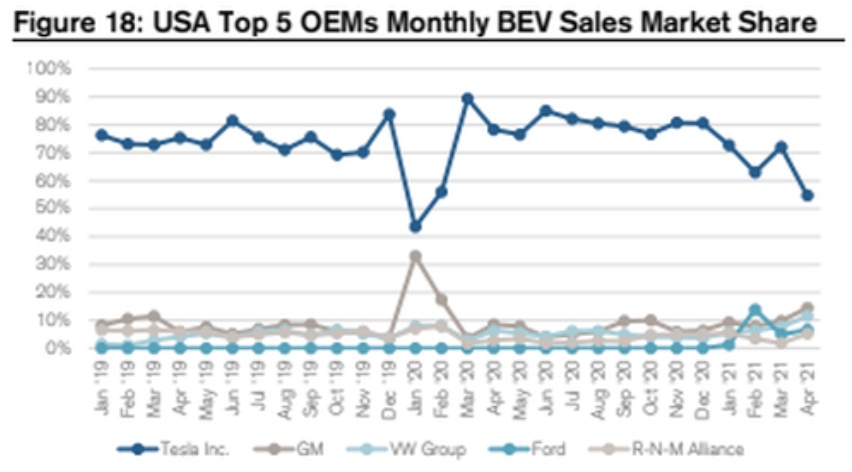 欧洲方面,特斯拉的市场份额仅为2%,相比之下,该公司在3月份的份额为22%。