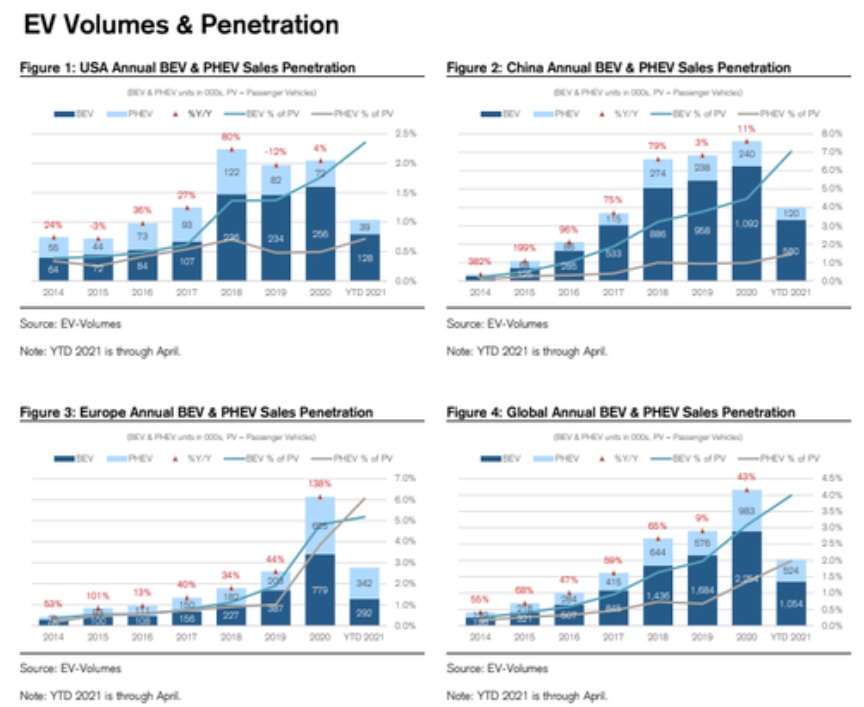 Levy指出,4月份全球电动汽车销量占全球新车总销量的6.1%,远超2020年4.4%的增速。