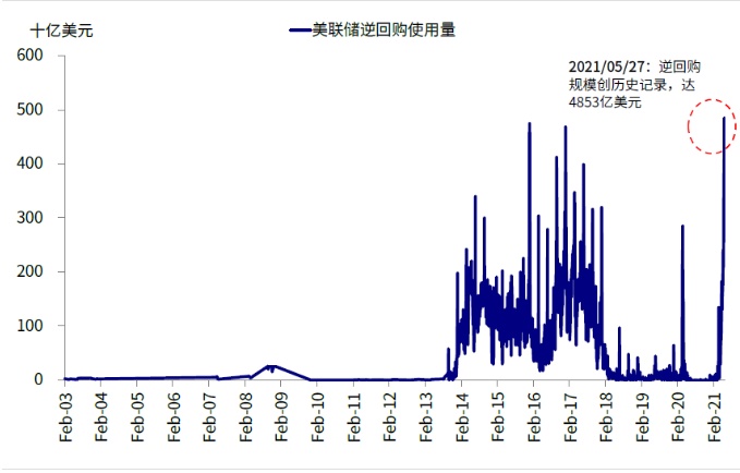 图表:美联储近期逆回购使用规模创纪录新高,5月27日当日逆回购规模达4853亿美元