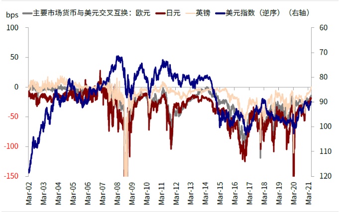 图表: 衡量全球美元流动性的欧元日元和英镑与美元的3个月交叉互换也都基本创下2015年以来的新低