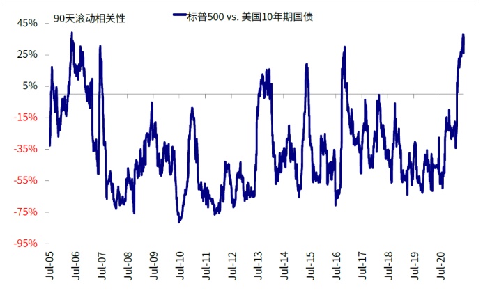 图表: 当前以标普500指数和美国10年期国债收益率为代表的股债相关性达到历史相对高位…