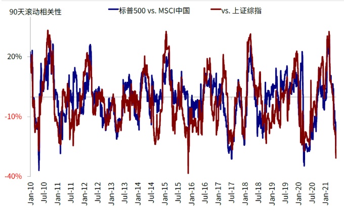 图表: …而当前中美股市之间的相关性处理历史相对低位