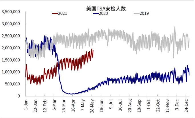 ►增长:线下消费与出行需求正在持续修复,出行人数创疫情以来新高。疫苗接种持续推进使得开放进程不断推进,目前美国37个州已经开放,我们预计6月底7月初有望进入全部开放状态。更大范围内的开放意味着更多的出行和线下服务性消费需求的释放,这一点从高频指标上已经得到明显体现(例如刚刚过去的阵亡将士纪念日的机场TSA安检出行人数创出疫情以来新高),进而支撑需求在三季度的后劲,甚至也可能意味着就业市场的修复(我们注意到开放与未完全开放州的失业率修复相差较大)。