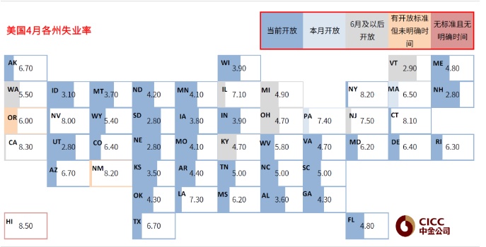 图表:从美国4月公布的各州失业率来看,开放与未完全开放的州的失业率相差较大