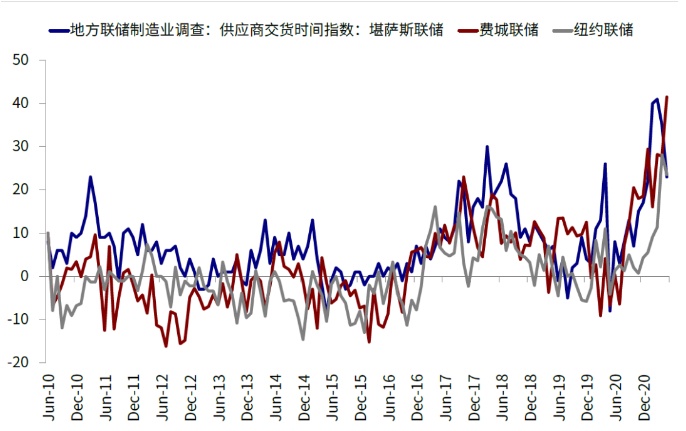 图表: 从地方联储调查中的供应商交货时间指数来看,5月份局部的供应瓶颈已经出现改善(交付时间环比回落)