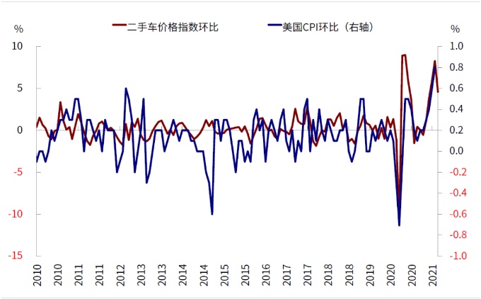 ►通胀:4月大超预期的通胀压力来自再度扩大的供需裂口,但这一裂口从供需两端看都有望出现边际缓解。需求侧3月下旬1.9万亿美元财政刺激后的消费从高峰回落、而供给侧因为寒冷天气和缺少芯片等因素的瓶颈也在修复,5月份局部的供应瓶颈已经出现改善(交付时间环比回落)。从行业来看,4月份价格环比大超预期的主要是二手车(供应瓶颈)和机票(开放需求),但从目前高频数看,5月二手车价格环比增速已经明显回落。我们测算,只要年内每个月环比平均增速不超过0.2%的话,5月CPI同比便将是年内高点。