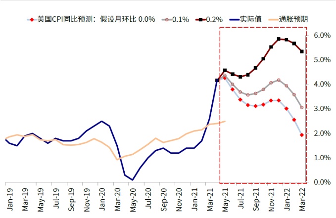 图表: 我们测算,如果年内月平均环比不超过0.2%的话,那么美国CPI同比高点就将在5月出现