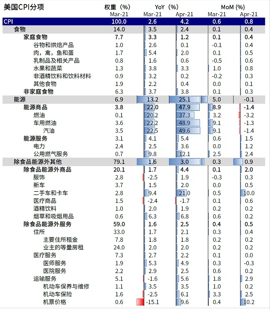 基准情形下,我们倾向于认为通胀压力或边际缓解(同比因基数效应将继续抬升但环比有望回落)、就业市场较4月改善但依然趋紧、美联储因此维持耐心直到夏天或三季度。而渡过上半月数据和政策扰动后,我们预期市场关注点将从4月的价格和5月的流动性再度转向美国更大范围开放后的需求修复,也即重回增长主线。此时,美元有可能再度走强,而黄金或承压。