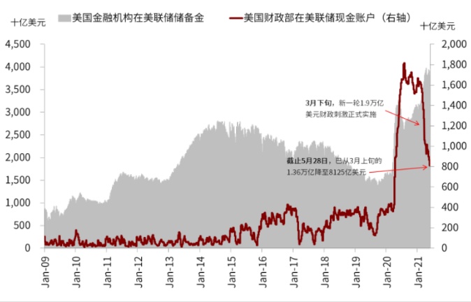 ►货币政策和美元流动性:上述组合下,我们倾向于认为就业市场长期修复依然是美联储的主要考量依据,因此美联储有望维持耐心按兵不动,当然不排除对利率走廊做出技术性微调。根据当前~800万就业缺口的修复速度,我们测算四季度可能是开始减量的窗口,而三季度或者夏末Jackson Hole年会可能提示减量,这一时间也正好对应全部开放后新增消费需求和就业的释放。美元流动性在这一背景下,结合美国财政部现金账户的持续回落,仍有望维持相对宽松局面,但我们怀疑还会类似于过去一段时间那样进一步加强(《近期美元流动性激增的内外部含义》)。