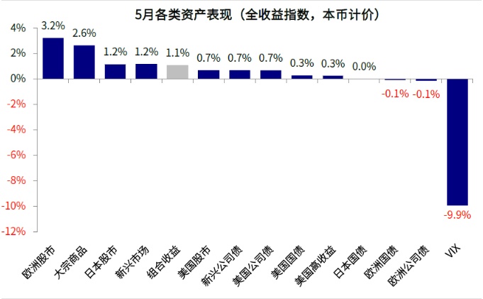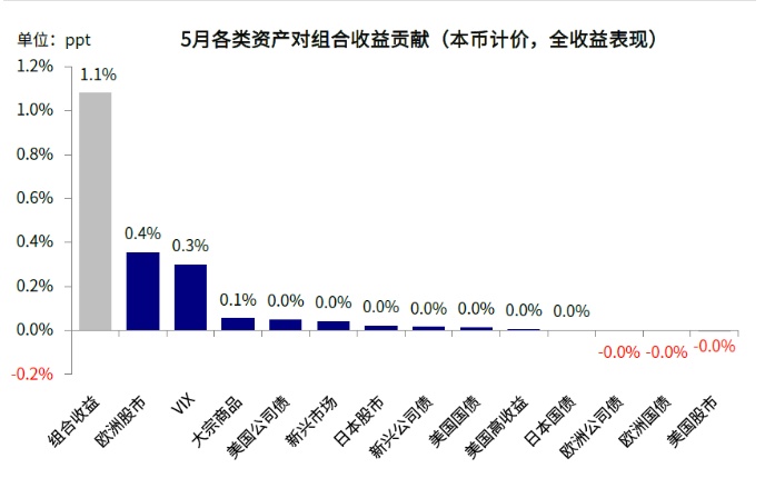 图表:5月,我们的海外资产配置组合上涨1.08%(本币计价)