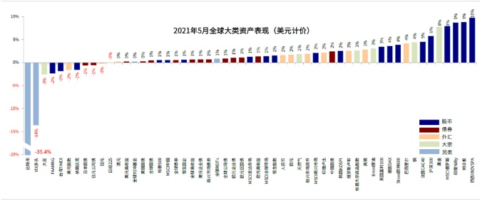 图表:5月全球大类资产表现:美元计价下,大宗>股>债,创业板、俄罗斯及印度股市、黄金、铜领涨;比特币、VIX多头、大豆、FAAMNG领跌