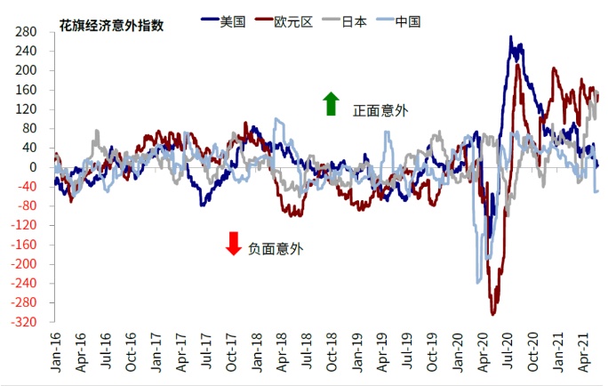 图表:5月美国、欧洲以及中国经济意外指数回落,日本抬升