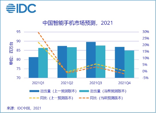 针对中国市场,虽然得益于“就地过年”以及相关的刺激消费政策,第一季度,尤其1-2月份,国内手机市场交出了一份“开门红”的答卷,但由于国内整体换机需求没有明显提升,换机周期也未见缩短,在需求预支后,整体市场在3月开始出现呈现下滑趋势。同时,随着2021年大部分安卓厂商重磅产品的发布和销售节奏集中提前至第一季度,第二季度来自产品端对消费者的刺激元素也将有所减少。IDC认为,第一季度市场表现虽然超出预期,但二季度与下半年的市场容量将有所减少,全年出货量将维持同比约6%的小幅增长。