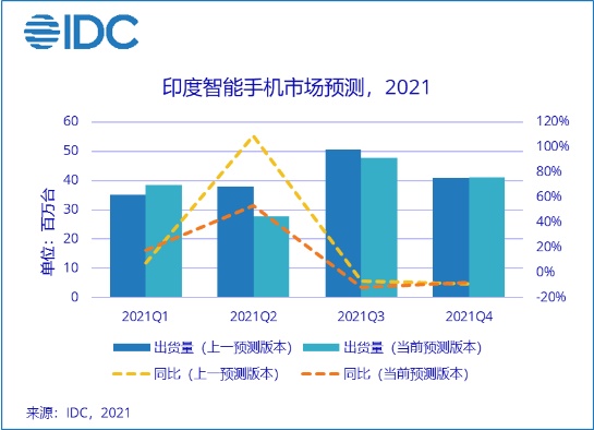 印度市场方面,疫情的反复将对第二季度以及全年市场需求产生巨大影响。目前,印度的主要城邦仍处于封锁状态,而且暂无迹象表明供应链问题将得到缓解。在生产方面,虽然政府没有关闭任何业务,但由于工厂只能安排一个班次,或更少量员工,因此会受到影响。但各厂商倾向在预计的市场重新开放时间之前——6月或晚些时候——就做好准备,以避免届时供应受到限制。因此,他们试图在这一时期开足马力,尽可能地进行生产。在销售层面,智能手机产品的在线渠道并未完全关闭,仍然可以在安得拉邦、泰伦加纳邦和古吉拉特邦等少数几个城邦发货。此外,一些线下渠道的商家也利用社交媒体来推广产品,从而产生了一定的销量,这与去年的做法类似,但与正常情况下的销量相比,这些销量微不足道。因此,IDC预计印度智能手机市场2021年下半年将遭遇同比超过10%的下滑。全年来看,市场容量约1.55亿台,同比增幅将由上一版本的9.9%放缓至3.6%。