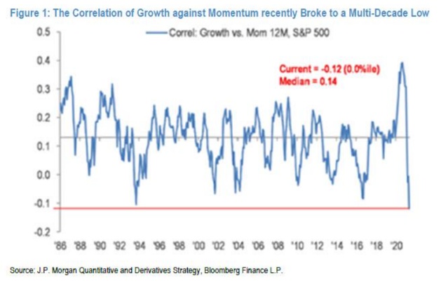 周三,摩根大通量化策略师肖恩·奎格(Shawn Quigg)在其最新报告中指出,成长股(Growth)与动量股(Momentum)之间的相关性已经被打破,在经济重启将推动通胀和利率上升的情况下,市场迅速向价值资产重新配置,这对科技股等在通缩环境中受益的股票来说是不利因素。