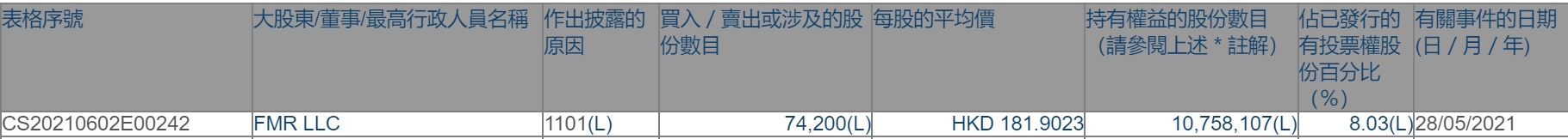 智通财经APP获悉,香港联交所最新资料显示,5月28日,FMR LLC增持康龙化成(03759)7.42万股,每股作价181.9023港元,总金额约为1349.72万港元。增持后最新持股数目为1075.81万股,最新持股比例为8.03%。