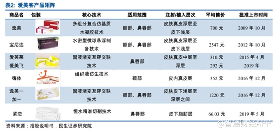 作为医美龙头企业,爱美客主要产品涉及人体的额部、鼻唇部以及颈部,目前主要有6款产品,商品名分别为逸美、宝尼达、爱芙莱、爱美飞、嗨体、逸美一加一、紧恋。