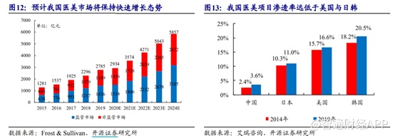 随着我国经济增长及中产阶级群体崛起,人均可支配收入增加叠加消费者医美意识提升,推动我国医美市场高速增长。根据 Frost & Sullivan 数据,2019 年我国监管医美市场规模为1436 亿元,2015-2019 年 CAGR为22.5%,但相比于美国、日本、韩国等发达国家,我国医美市场还处于刚起步阶段。从医美项目渗透率(每千人中接受医疗美容疗程的比率)来看,根据艾瑞咨询数据,我国与其他医美行业发展成熟的国家相比仍处于较低水平:2019年我国医美项目渗透率仅为3.6%,相比日本11.0%、美国 16.6%、韩国20.5%的水平仍有很大提升空间。根据 Frost & Sullivan 数据,2024年我国合规医美市场规模有望达到 3185亿元,2019-2024 年CAGR将保持在17%以上。