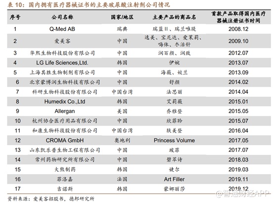 行业空间大,增长强劲,自然吸引无数企业入局。如昊海生科(688366.SH)、华熙生物(688363.SH)、华东医药(000963.SZ)、四环医药(00460)等。