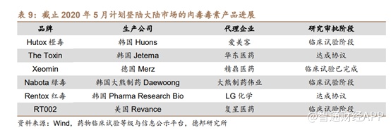 再看肉毒素,着眼市场布局,目前已有华东医药和 LG 化学已达成针对中国市场的肉毒毒素相关协议,爱美客(Hutox)、复星医药(RT002)和大熊制药(Nabota)已进入临床阶段,精鼎医药(Xeomin)已完成临床试验。参考医美大国韩国肉毒毒素呈现国产进口、中低高端各品牌百花齐放的竞争格局,我国肉毒毒素市场在迅速且持续扩容的同时亦有被多品牌瓜分的高度可能。
