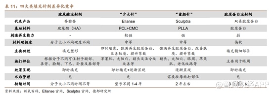 除了上述两个领域外,在诸多企业布局的背景下,国内的填充塑形也进入再生2.0 时代。华东医药近期引进的Ellanse“少女针”获批上市,瞄准东亚“童颜少女感”市场助推填充剂进入2.0 持久再生时代。少女针主要由30%PCL(微型晶球聚己內脂)和70%CMC(PB-S 生物降解材料)构成,具有填充塑形+胶原刺激再生的双重功能,针剂属于活性可代谢材料但效果可维持2- 4 年之久。爱美客亦着眼长效塑形紧致领域,于 2012 年推出长效玻尿酸产品宝尼达后,目前正在进行“童颜针”的在研项目对标法国明星产品Sculptra塑然雅。