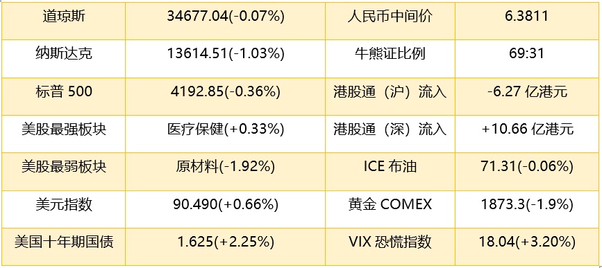 1、 隔夜美股截至收盘,道琼斯指数收盘下跌23.40点,跌幅0.07%,报34576.98点;标普500指数收盘下跌14.32点,跌幅0.34%,报4193.80点;纳斯达克综合指数收盘下跌141.82点,跌幅1.03%,报13614.51点。港股ADR指数也跌,按比例计算,收报28907点,跌58.90点或0.20%。