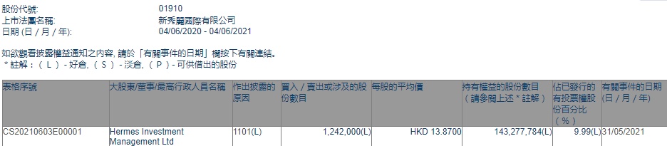 Ltd增持新秀丽(01910)124.2万股,每股作价13.87港元,总金额约为1722.65万港元。增持后最新持股数目约为1.43亿股,最新持股比例为9.99%。