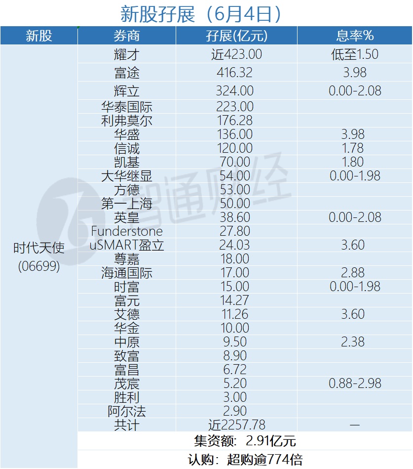智通财经APP获悉,时代天使(06699)正在招股中。截至6月4日,富途、辉立、耀才等合计分别为其借出近2257.78亿港元,超购逾774倍。