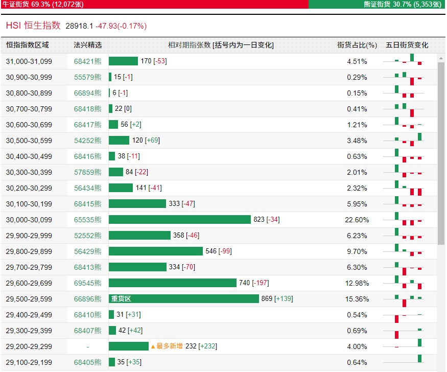 法兴恒指牛熊证街货分布图中的数据显示,熊证街货重货区在29500-29599区间,该区间最新熊证数量为869张,较上一交易日增加139张;最多新增在29200-29299区间,该区间最新熊证数量为232张,较上一交易日增加232张。