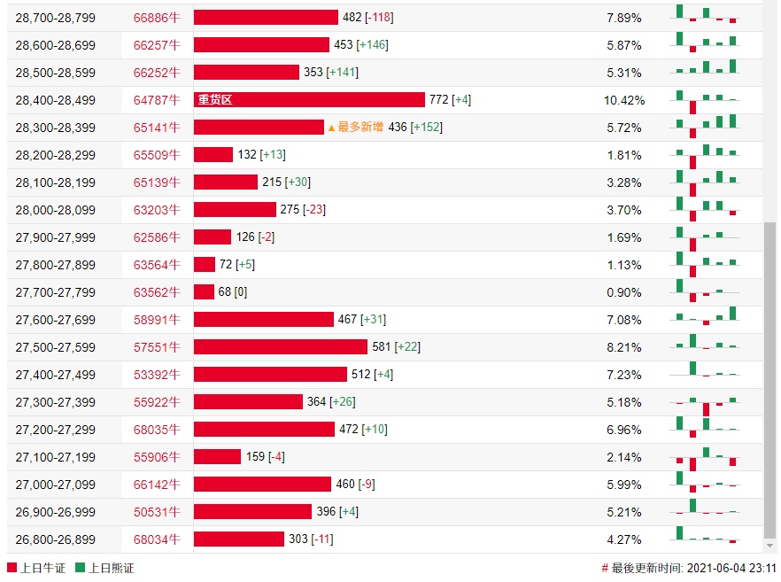 牛证街货重货区在28400-28499区间,该区间最新牛证数量为772张,较上一交易日增加4张;最多新增在28300-28399区间,该区间最新牛证数量为436张,较上一交易日增加152张。