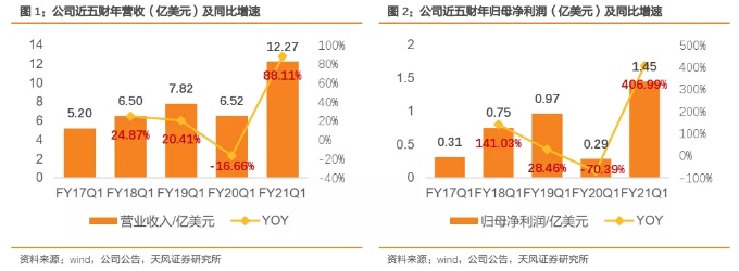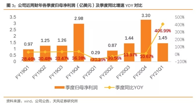从财年季度归母净利润同比增速来看,FY21Q1同比增速较20Q3、Q4均有进一步提升;排除FY20Q1低基数影响,FY21Q1较19Q1增长50.10%,该增速较FY20Q4对应同比增速明显加快。