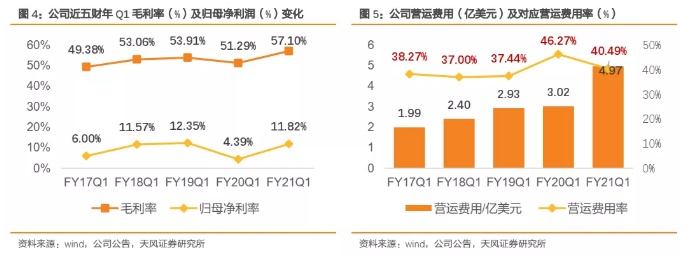 公司营运费用率(销售、行政及一般费用率)达到40.49%,同比FY20Q1大幅减少、明显改善(-5.78pct)。
