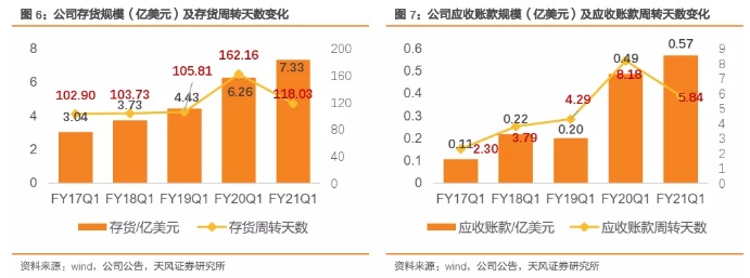 公司FY21Q1存货规模增至7.33亿美元(+17.10%),对应存货周转天数为118.03天(-44.13天),存货周转天数同比明显减少,周转效率同比明显改善。
