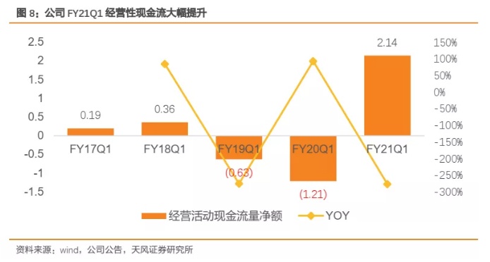 现金流方面,公司FY21Q1经营性现金流净额达到2.14亿美元,较此前FY19、FY20同期(分别为-0.63、-1.21)由负转正,现金流情况大幅提升,公司现金周转运营能力明显改善。