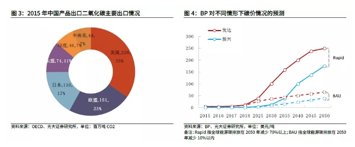 根据OECD数据,2015年我国对外出口约6亿吨CO2,其中对美出口2.26亿吨,占比约35%。假设国际对我国按40美元/吨征收碳税,增加开支约260亿美元;按100美元/吨,增加650亿美元。假设我国碳排放成本全部内部化,2019年我国碳排放98.26亿吨,按碳价100美元/吨测算,需9826亿美元。