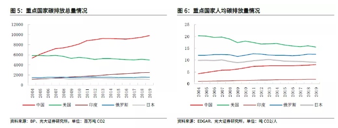 为什么“新冠疫情”后,我国推动“碳中和”更加迅速?——增加国际声誉和话语权。2019年我国碳排放量达98.26亿吨位列全球第一(人均碳排放和碳排放量/GDP均相对较低),自2005年以来为全球碳排放总量最高的国家(加入世贸组织后,全球产业链分工变化所致)。近年来我国碳排放增速已有所放缓,但较为庞大的人口基数使得我国碳排放全球占比仍在持续提升,2019年达28.76%。
